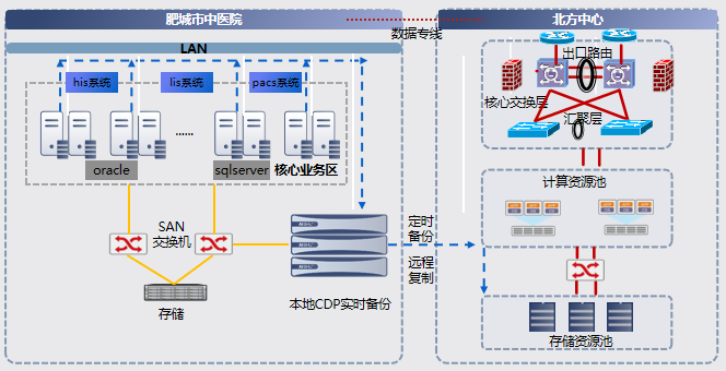 肥城市中医院院端使用部署CPD实时备份:在文件系统级别进行IO复制实现备份,同时会将数据库日志进行实时复制,一键恢复、挂载数据,保障数据完整、无丢失;同时支持服务器整机备份,在服务器发生故障时快速恢复至其他服务器。院端与北方中心通过数据专线连通,将本地备份系统、数据定时远程复制至北方中心进行异地灾备。在本地机房发生灾难时,快速恢复应用服务保障数据不丢失。