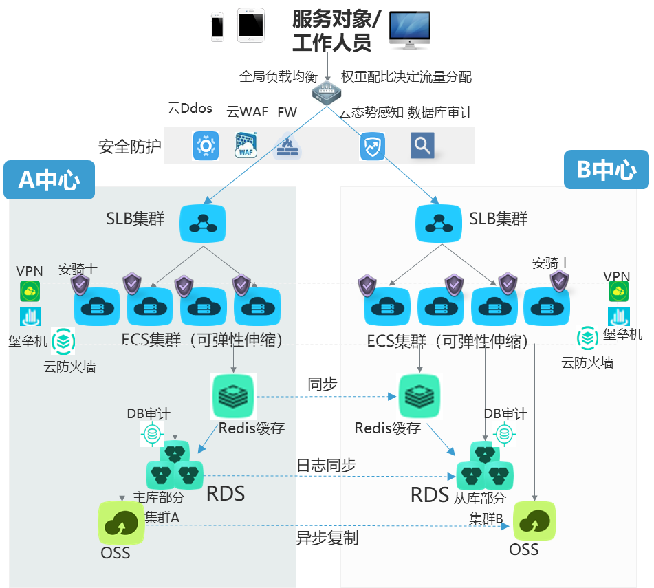 通过建设政务云医保域建设(数据中心B),实现两个数据中心业务应用层双活负荷分担,系统之间可以相互进行健康状态监视和功能切换,当一处系统因意外(如火灾、洪水、地震、人为蓄意破坏等)停止工作时,整个应用系统可以切换到另一处,使得该系统功能可以继续正常工作并能够确保数据不丢失,保证生产中心不能正常工作时数据的完整性及业务的连续性,并在最短时间内由灾备中心接替,恢复业务系统的正常运行。