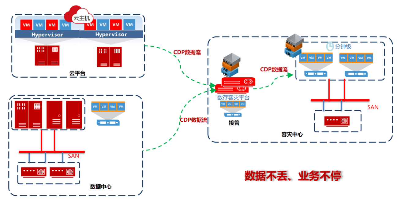 可根据不同的业务需求,提供实时连续数据保护(CDP)、定时备份、远程容灾、故障切换、应急接管等功能。完美兼容公有云、私有云、虚拟化云平台、物理服务器及混合架构下的业务系统,对各类用户重要的业务系统进行高效可靠的容灾保护,全面保障业务数据安全与可持续性运转。