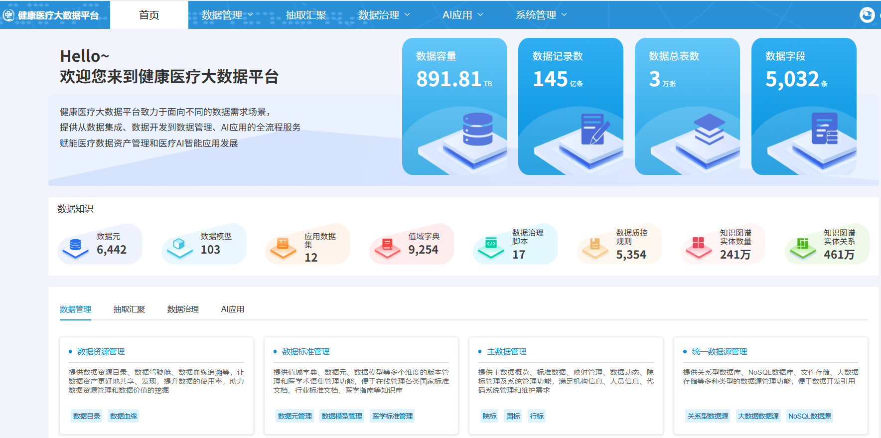 数据管理与展示:面向医疗数据资源管理及展示需求,提供数据资源分层管理,数据标准管理、数据资源视图展示,数据血缘全景等功能,便于用户直观获取数据资源全貌,并对数据资源进行管理。