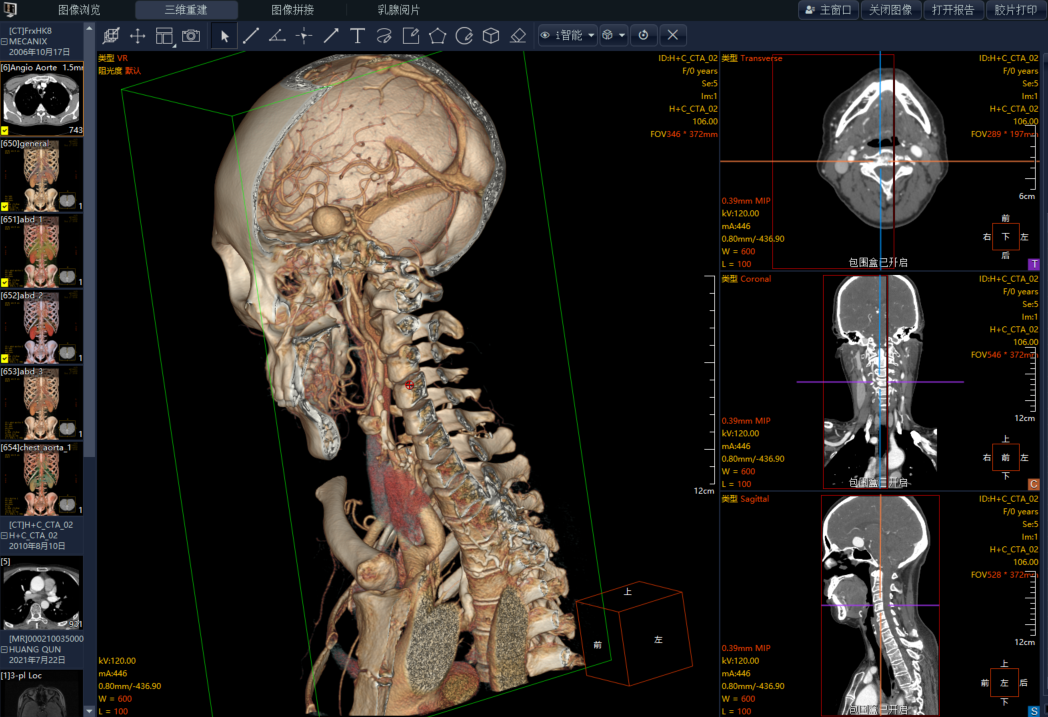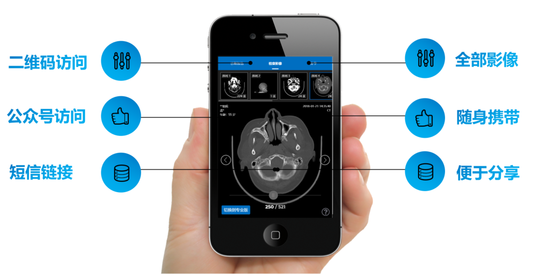 三维图像处理支持双斜位重建、MRP厚度重建、MIP、AIP、MinIP。系统支持二维码、公众号、短信链接多种线上影像查询方式。