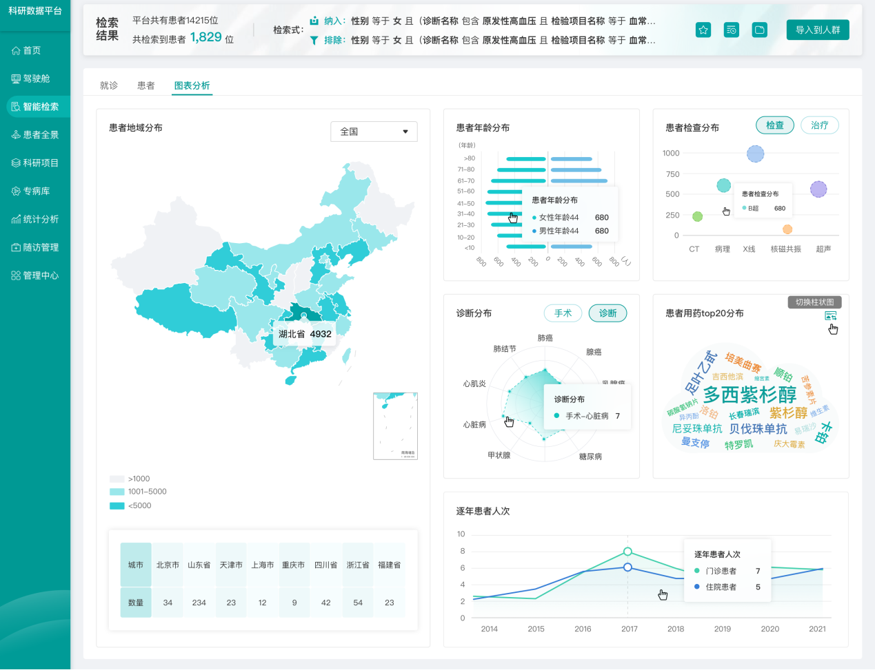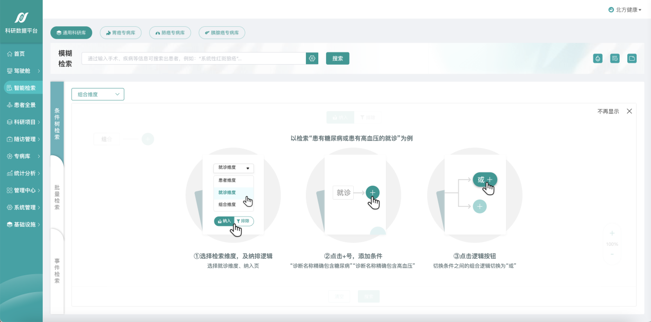 1、智能检索:科研人员通过定义检索条件,查找目标患者用于科研分析,支持模糊检索、批量检索、条件树检索及事件检索。