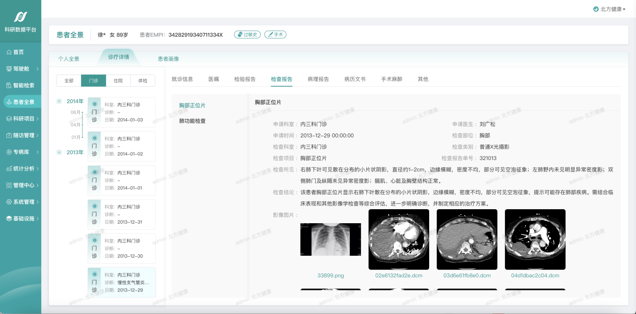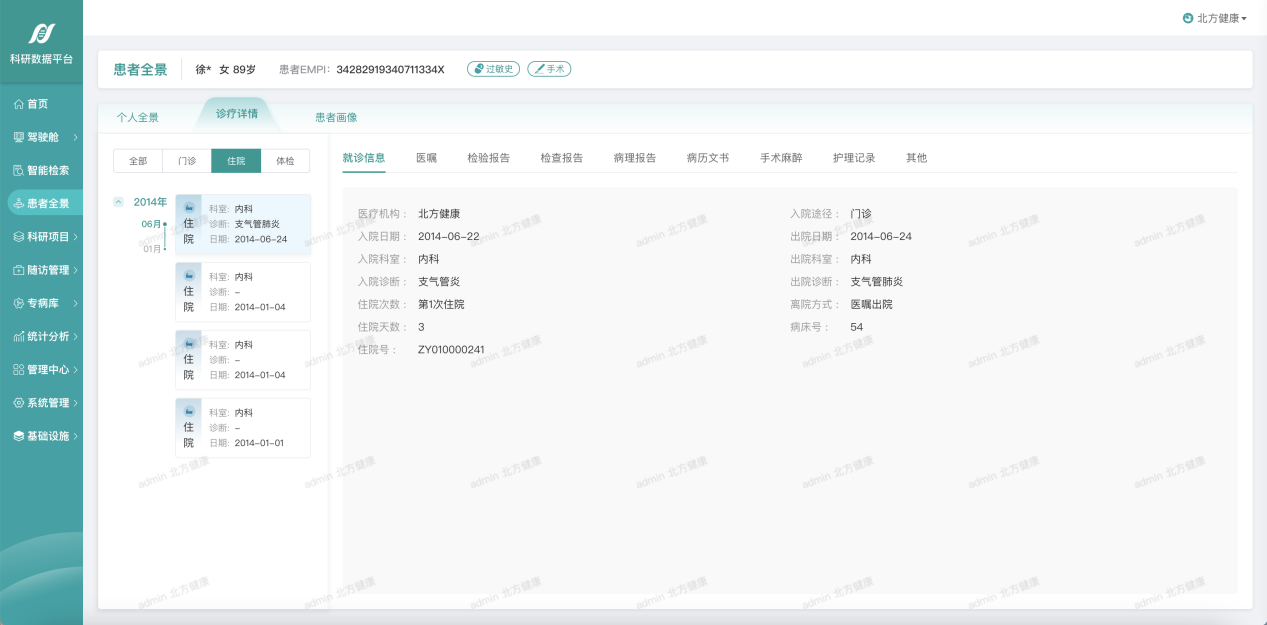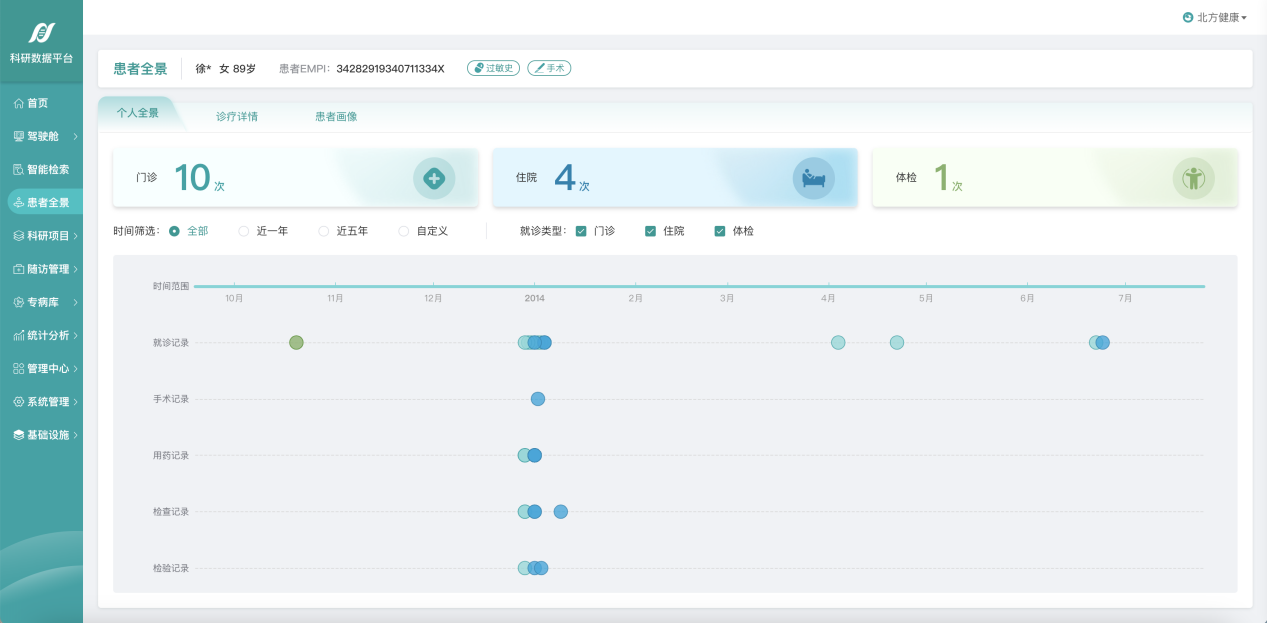 2、患者全景:全面多维展示患者个人全景时间轴、历次诊疗详情以及患者诊疗画像,支持个人全景、诊疗详情以及患者画像信息的查看。