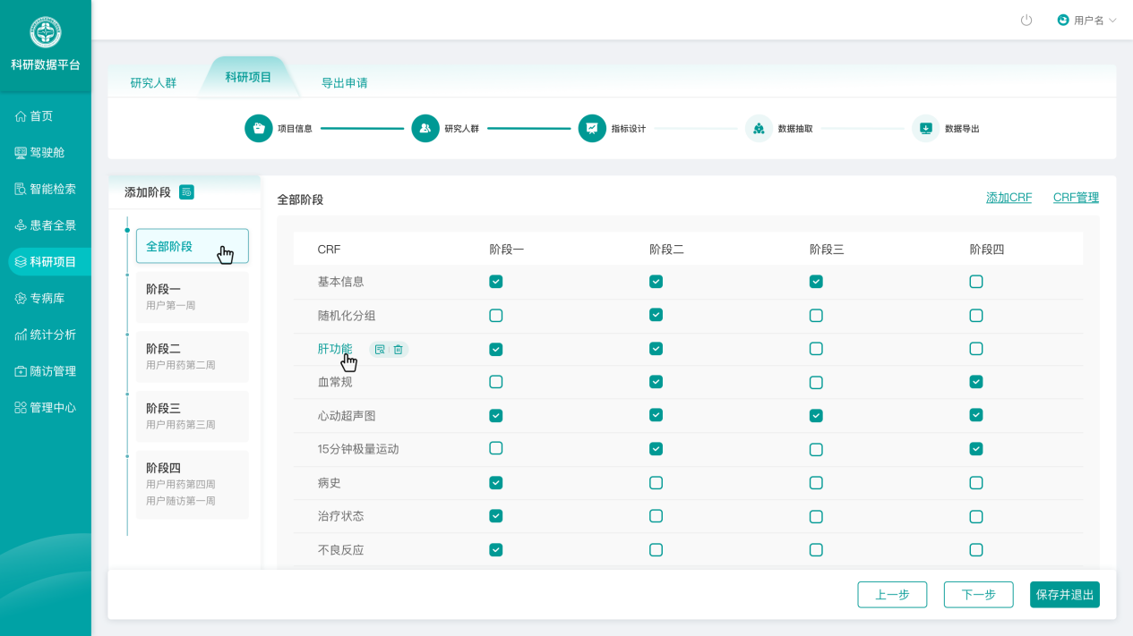 3、科研项目:科研人员对研究人群及人群的科研项目进行全生命周期的管理。包括对研究人群管理、科研项目管理、研究成果和数据导出模块。