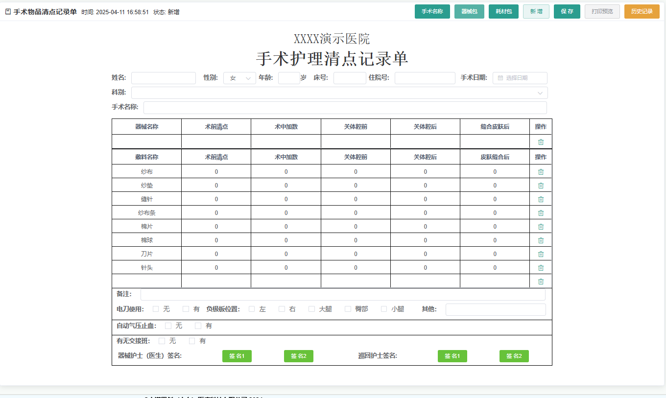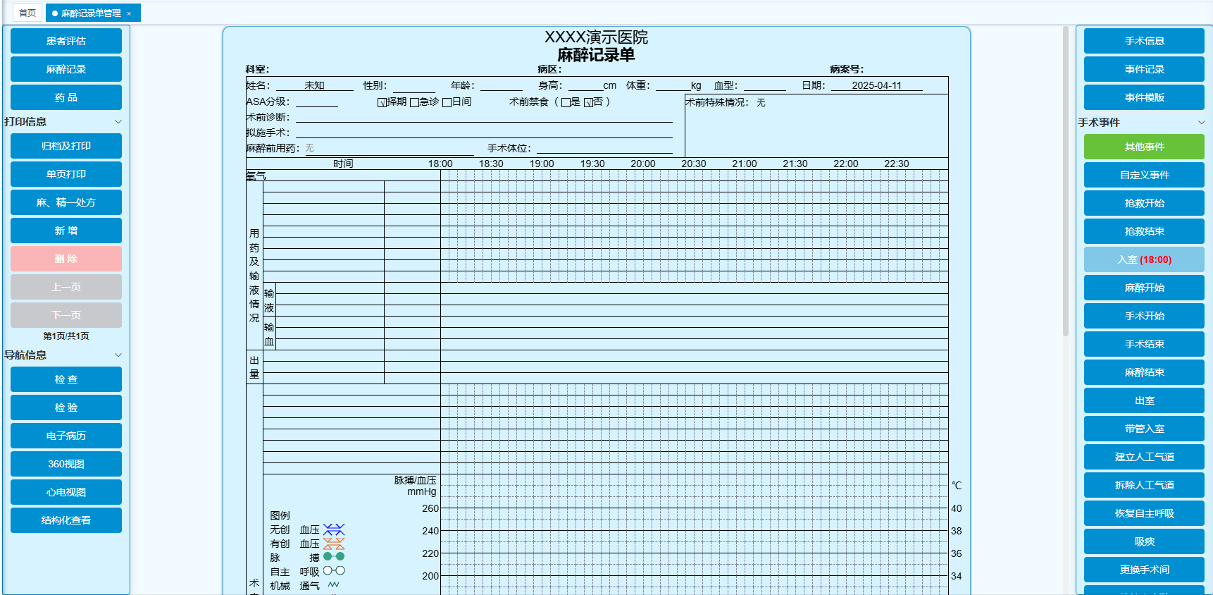 AMS手术麻醉信息系统可以使手术室和麻醉科的医护人员从繁琐的病历书写中解放出来,集中精力关注术中病人的监控和麻醉操作,将更多的时间用于分析、诊断和治疗。系统中可以详细记录病人相关信息(基本资料、麻醉计划、麻醉用药、麻醉事件、术中液体出入量、麻醉评估等)和诊疗相关信息(药品、医学数据字典等)。麻醉师可以根据需要,快速准确的查阅病人信息和诊疗信息,从而做出正确的诊断和治疗。