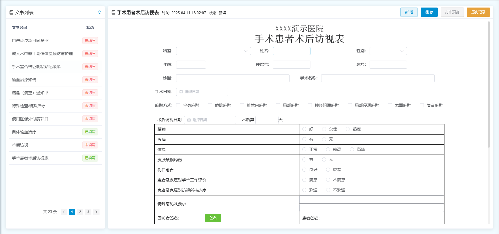 系统能够实现从“下达手术通知书→实施手术人员排程→术前麻醉评估→术中参数设置→术中信息采集→添加麻醉药品、手术事件、补液→术后麻醉总结→手术记录单→查看麻醉记录→统计分析”的整个流程的自动化和信息化。通过该系统,能够规范麻醉科和手术室的工作流程、实现麻醉、手术过程中的信息数字化和网络化、自动生成麻醉手术中的各种医疗文书、完整共享HIS、LIS和PACS等手术患者信息,实现对麻醉过程管理,从而提高整个麻醉、手术管理工作的水平。